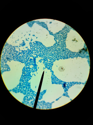 6. Counter stain with METHYLENE BLUE for 3-4 min. or so. Wash with water... Blot dry, add immersion oil and focus under 10X